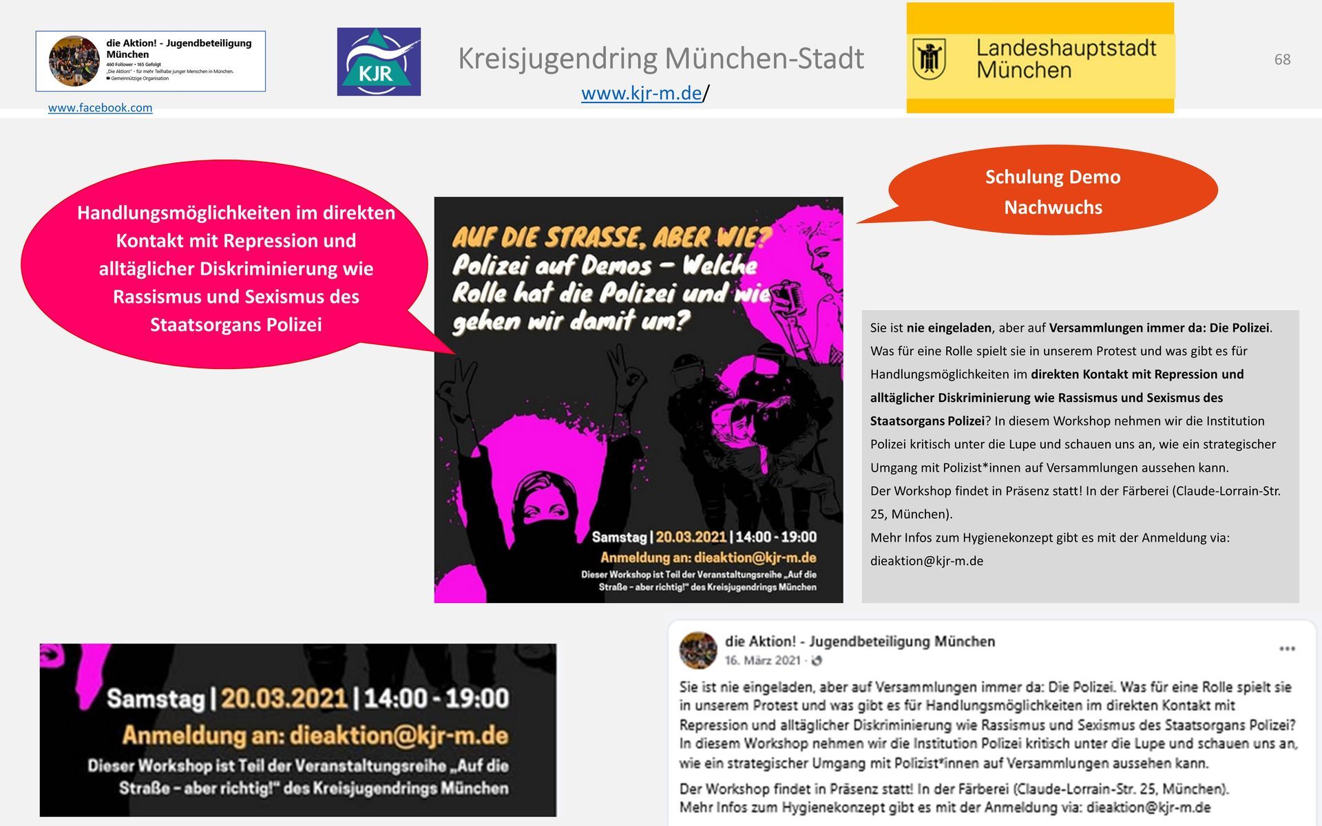 Im Workshop "Auf die Straße aber wie?" liest man „Sie ist nie eingeladen, aber auf Versammlungen immer da: Die Polizei. Was für eine Rolle spielt sie in unserem Protest und was gibt es für Handlungsmöglichkeiten im direkten Kontakt mit Repression und alltäglicher Diskriminierung wie Rassismus und Sexismus des Staatsorgans Polizei". Kurz gesagt: A.C.A.B. All cops are bastards.