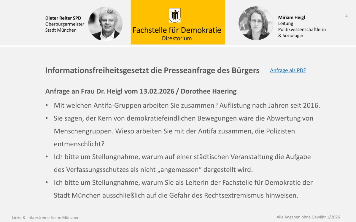 Der Antrag ist wie alle Anträge abgelehnt worden, höchstpersönlich von SPD-Oberbürgermeister Reiter. "Die Fachstelle ist beauftragt, sämtliche demokratischen Kräfte in München, die sich den Angriffen auf die Menschenwürde (…) entgegenzustellen.“ „Der „Extremismus“-Begriff hingegen verengt die Problemwahrnehmung und ist nicht zielführend, um das Problem umfassend zu bearbeiten.“